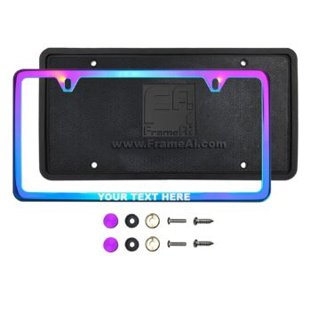 FrameAi Laser Etching Customize Two Hole Slim Version Neon Neo Chrome Mirror License Plate Frame Compatible with GMC Acadia T304 Stainless Steel + Metal Screw Caps