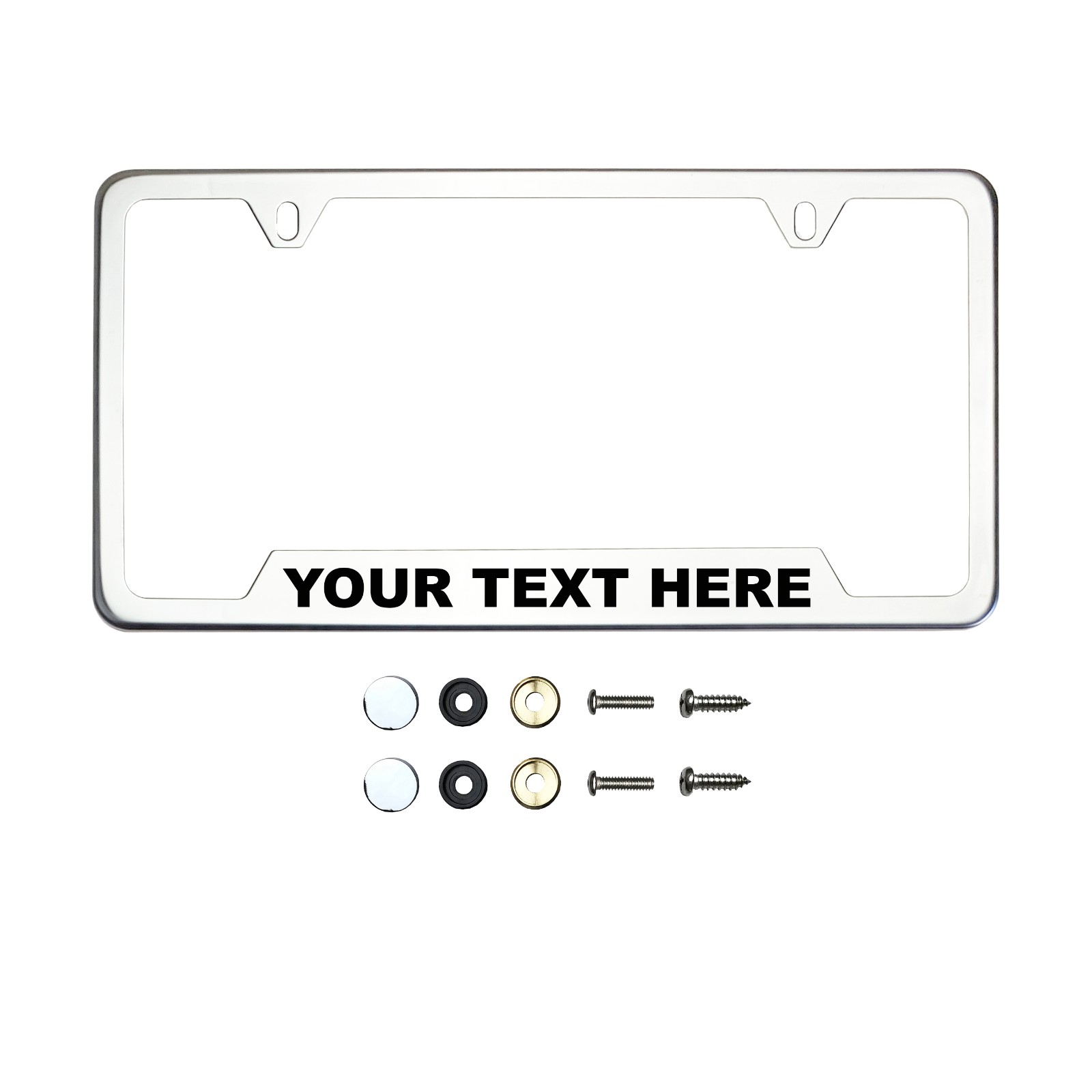 FrameAi Laser Etching Customize Black Lettering bottom Corner Cut Out Version Chrome Polish Mirror License Plate Frame T304 Stainless Laser Etching Customize nless Steel + Metal Screw Caps