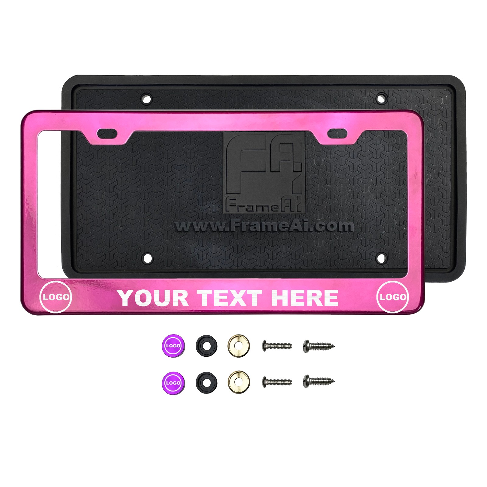 FrameAi Laser Etching Customize Raspberry Pink Chrome License Plate Frame Compatible with GMC Terrain T304 Stainless Steel + Metal Screw Caps