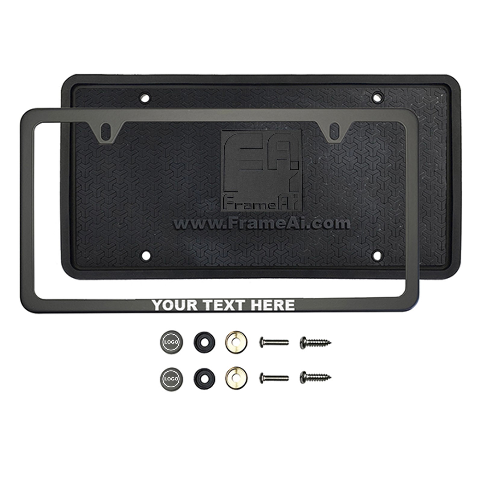 FrameAi Laser Etching Customize Two Hole Slim Version Matte Flat Black License Plate Frame Compatible with GMC Envoy T304 Stainless Steel + Metal Screw Caps