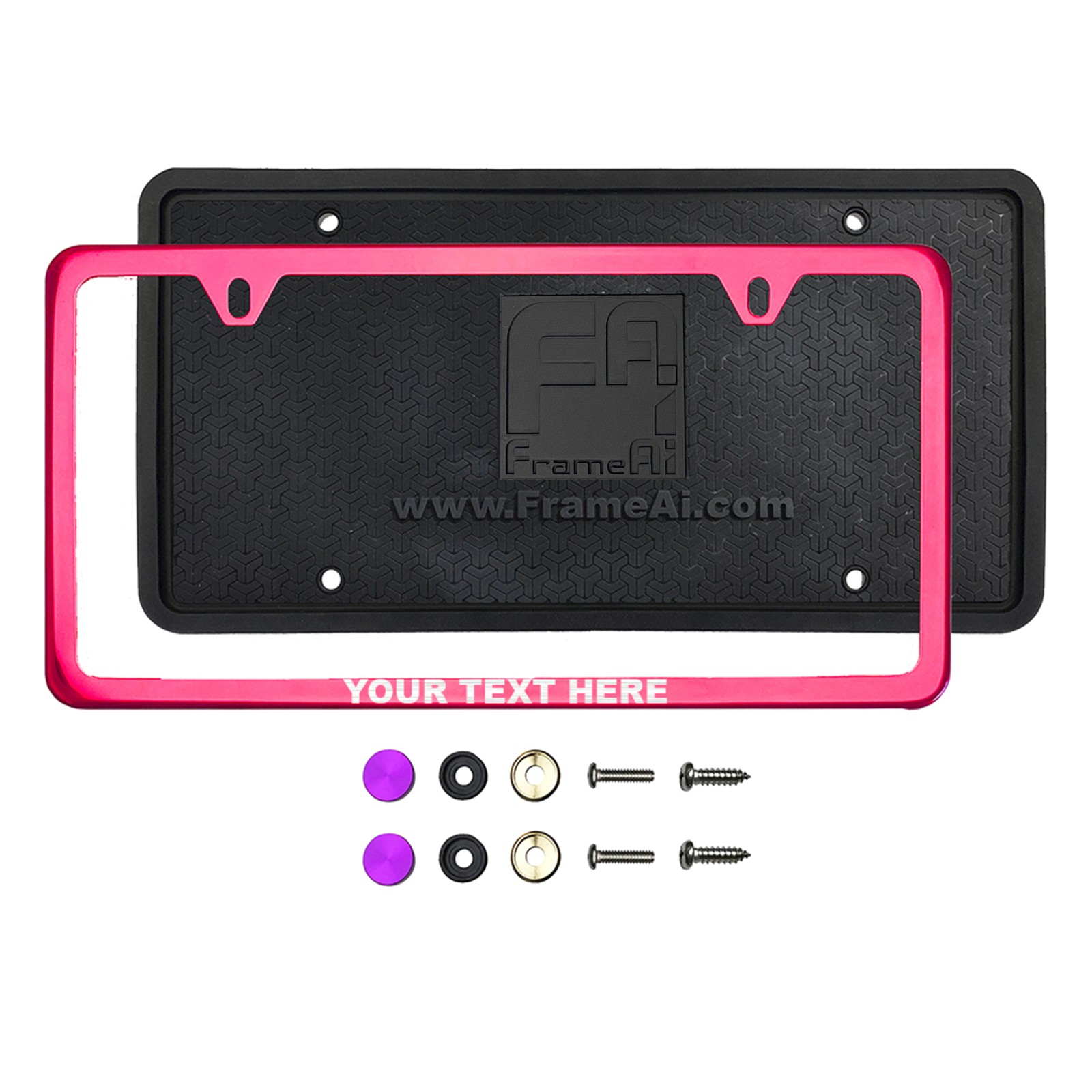 FrameAi Laser Etching Customize Two Hole Slim Version Raspberry Pink Chrome License Plate Frame Compatible with GMC Sierra T304 Stainless Steel + Metal Screw Caps