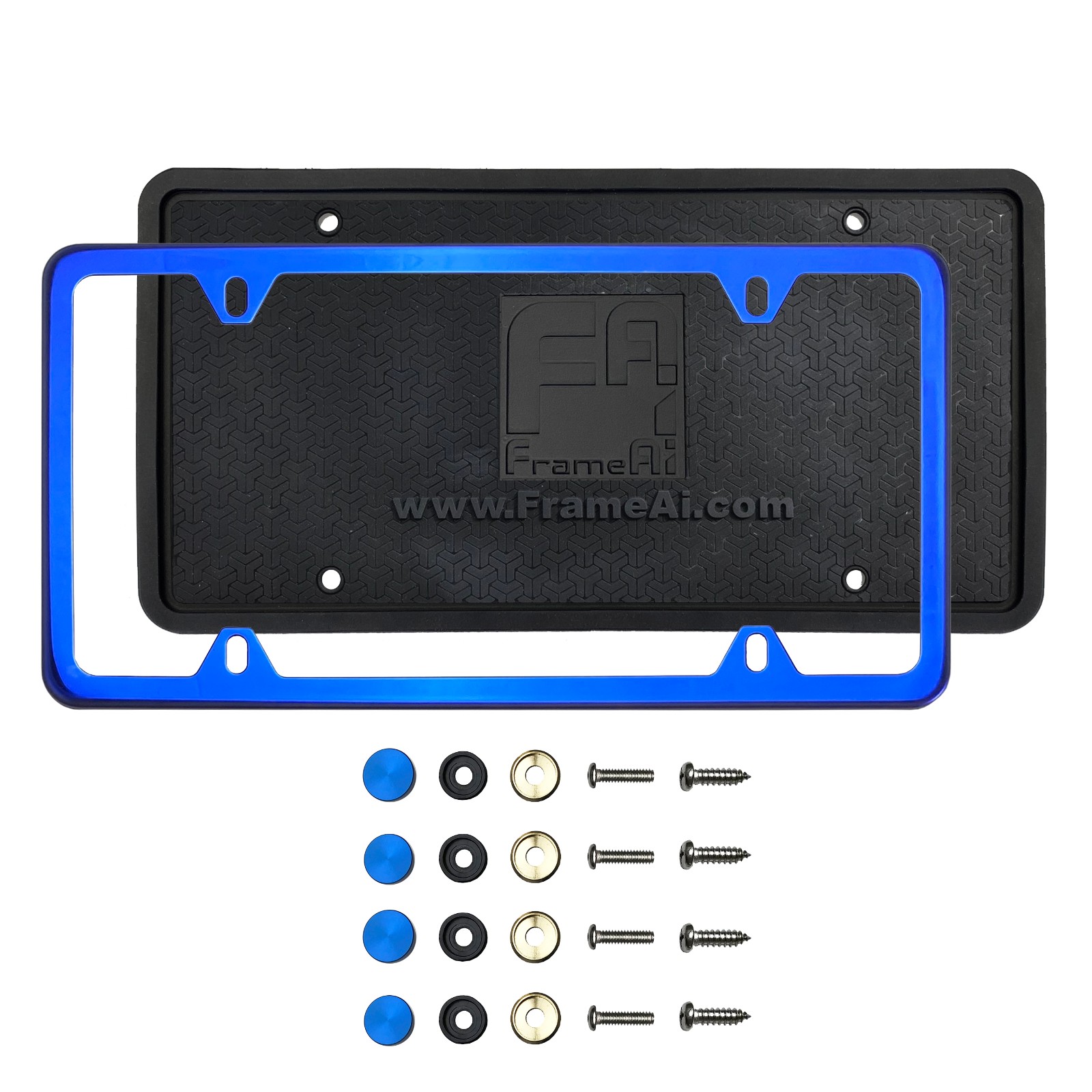 Silicone back Guard Four Holes Slim license plate holder Blue Chrome Mirror License Plate Frame T304 Stainless Steel + Metal Screw Caps