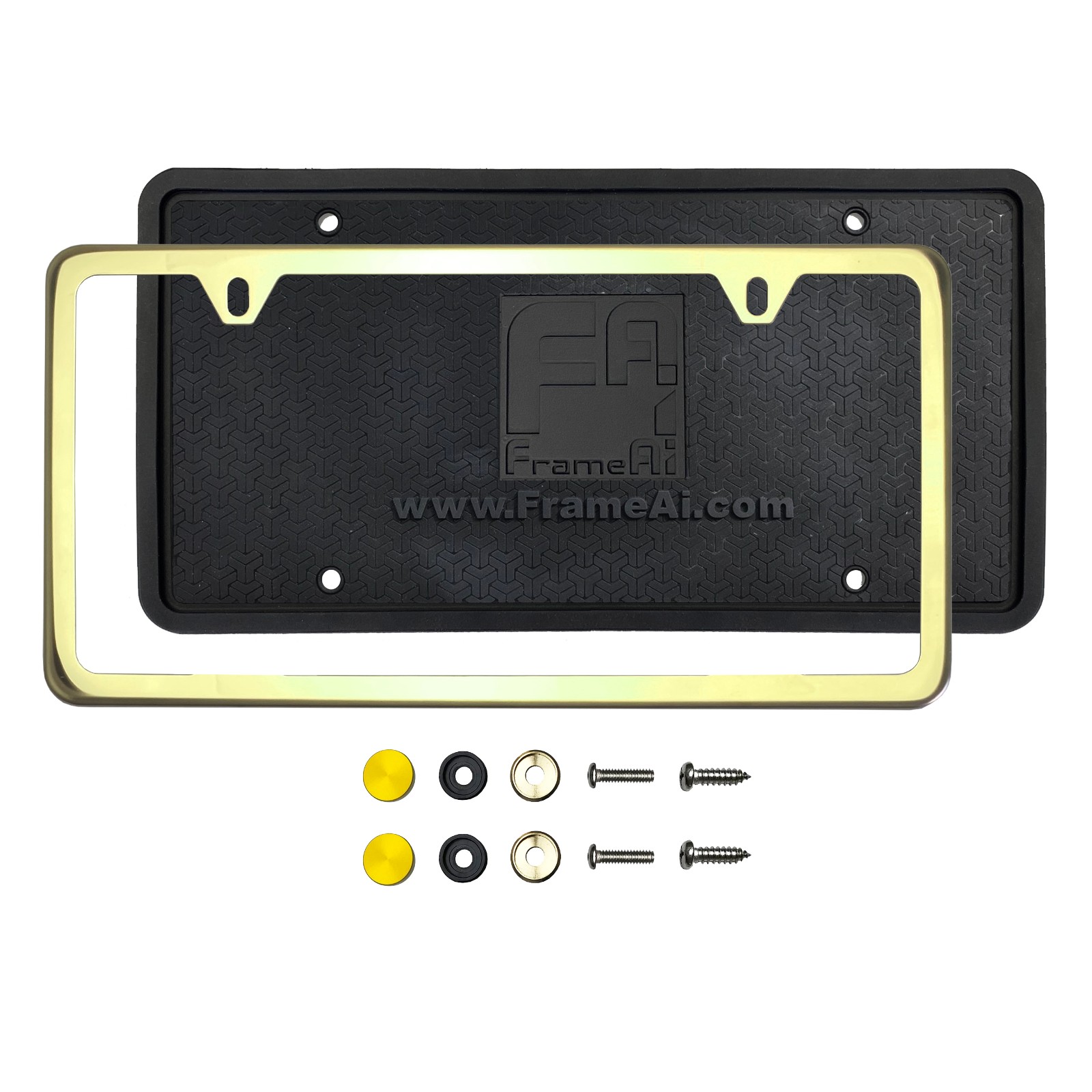 Silicone back Guard Two Holes Slim license plate holder Gold Chrome Polish Mirror License Plate Frame T304 Stainless Steel + Metal Screw Caps