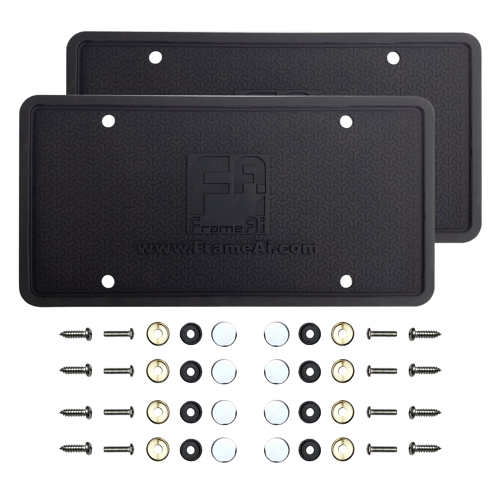 Two Silicone License Plate Frame Back Guard holder Rust-Proof Rattle-Proof Weather-Proof + Chrome Metal Screw On Caps Hardware